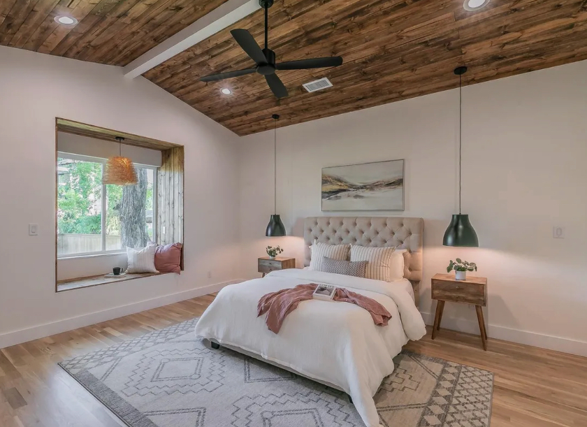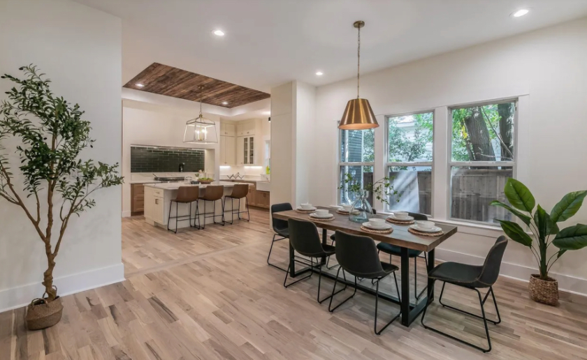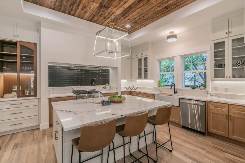 The transformation is truly astonishing. The house now has 10-foot ceilings with an original 5-foot pocket door separating the living and dining rooms. The kitchen is Instagram-worthy, featuring Dove White and Butterscotch cabinetry, Calacatta Tesoro quartz counters, and a massive 5-by-7-foot island. The addition of wood to the tray ceiling serves to add warmth and highlight the light fixture.