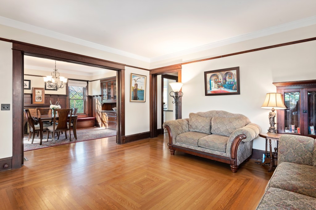 Just inside the front door, the living and dining room hold court at the front of the house, separated by hidden pocket doors. Built-in cabinetry and matching window seats show off the original gleaming wood. I smiled as I admired these classic features all over again, especially the concentrically patterned hardwood floors in these two rooms. Their obvious craftsmanship is well worth an encore of appreciation.